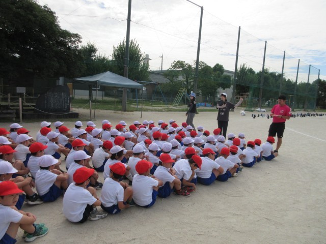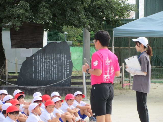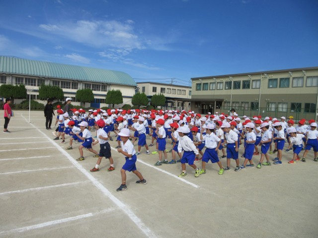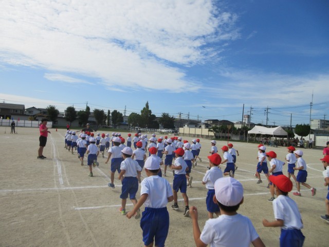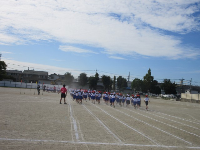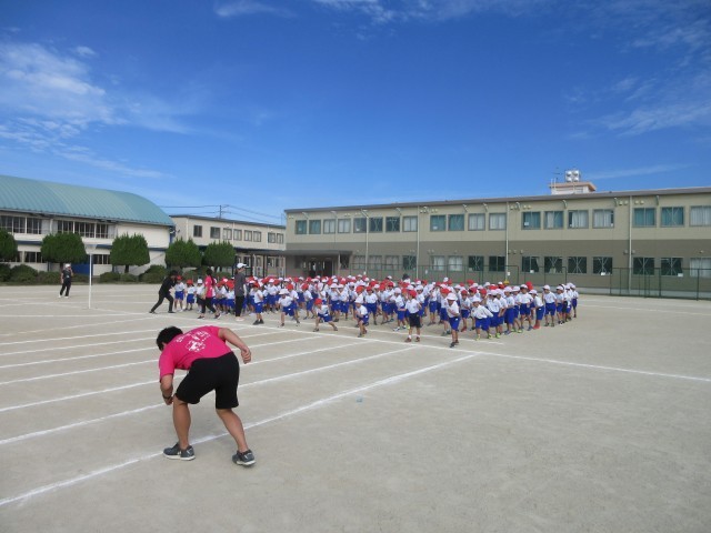 かけっこの練習の様子です。入場の時の合図や「かけあしすすめ」「全体とまれ」「12345」と止まるタイミング、何もかもはじめての1年生。先生といっしょに確認しながら練習しています。