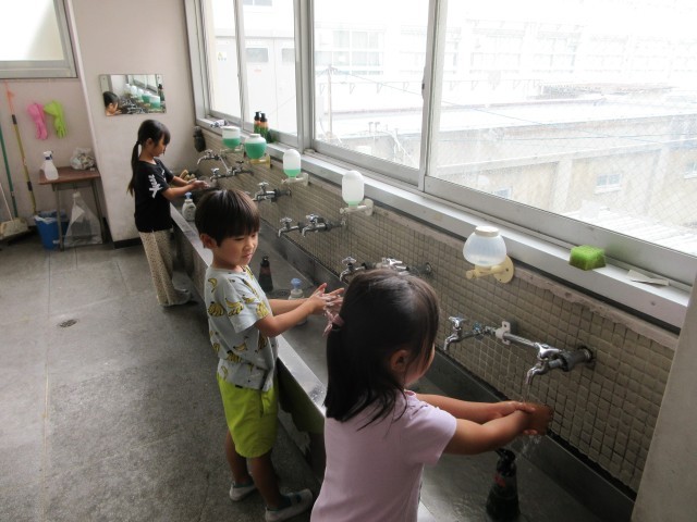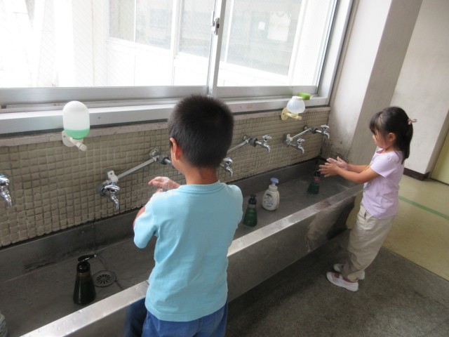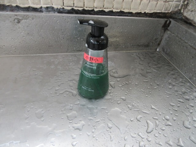 保健室の先生から手洗いのお話がありましたね。小野っ子のみなさん、新しい石けんポンプを使って、こまめな手洗いをしましょう。洗い残しが多いところは指先、指の間、手首だそうです。洗い残しがないように気をつけてください。