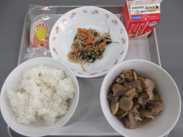今日の給食は、ごはん、牛乳、いも煮、ほうれん草とツナのおひたし、月見だんごです。今日は十五夜(お月見)の日です。愛知県には給食のように長細い形の月見だんごがあります。お隣の静岡県では平たく真ん中をくぼませた丸いだんごなど、地域によって特色があります。もちもちして甘いおだんごは大人気でした。