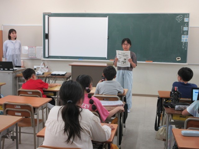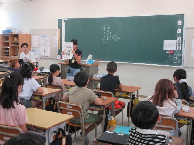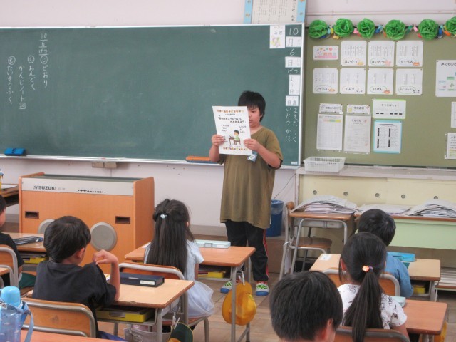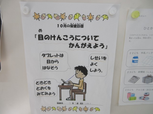 10月の保健目標は「目の健康について考えよう」です。保健委員さんが3つのポイントを紹介してくれました。一つ目は「姿勢をよくしよう」です。2つ目は「タブレットは近づいて見ないで、目からはなそう」です。3つ目は「時々遠くをみるようにしよう」です。さあ、大切な目を毎日の生活を気を付けることで守っていきましょう。