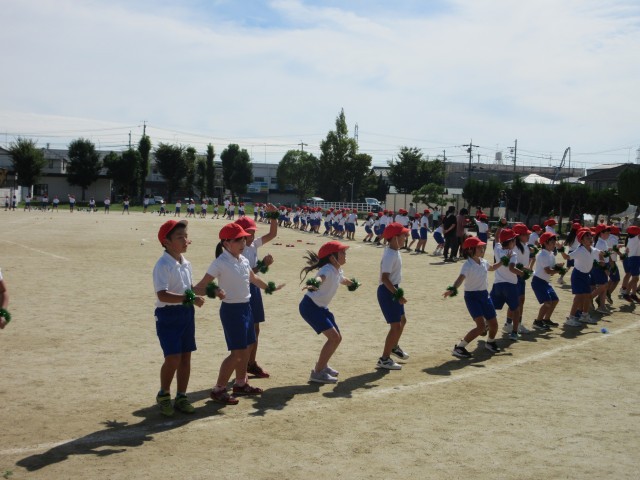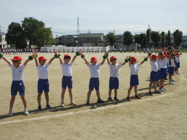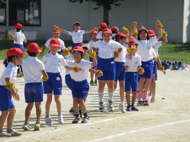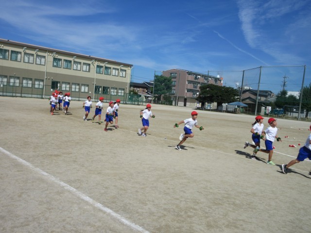 運動会練習の一コマです。キラキラのリストバンドが輝いています。玉取り競技とダンス、両方に挑戦している3年生のみなさん、元気いっぱいに演技してくださいね。
