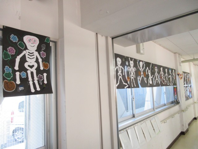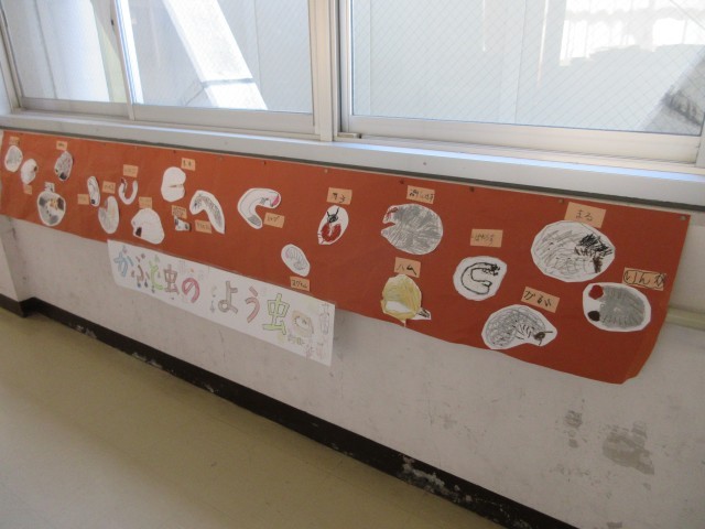本館1階の7組さんの廊下には図工や授業で見つけたものが飾ってあります。現在はハロウィンの表情豊かな作品やかぶとむしの幼虫たちです。ぜひみなさん、御覧ください。