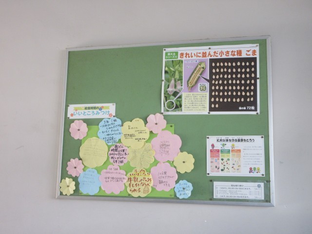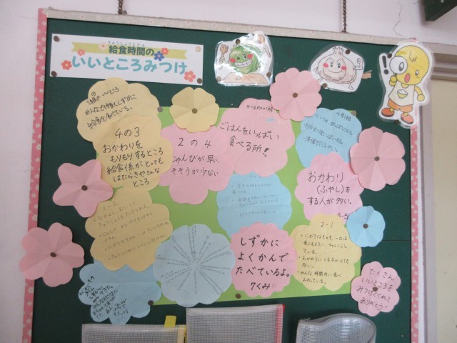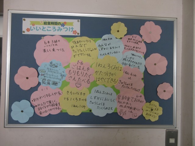 給食委員会のみなさんは、新企画給食時間の良いところ見つけをしてくれました。各クラスの良いところ紹介しています。4つある校舎の様々な場所で掲示もされています。2年生の良いところは「バランスよく食べていること」「苦手なものでも一口は挑戦しいていること」などと紹介がありました。いろいろな学年、学級でいいところがあります。ぜひ、お手本にしてくださいね。