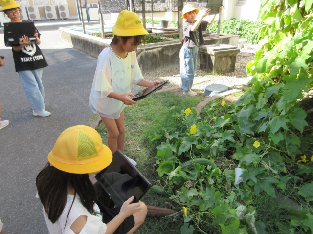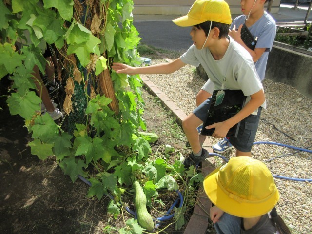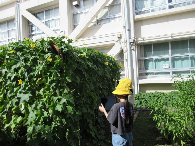 ヘチマの成長の様子を4年生が観察していました。ずいぶん夏のころとは様子が変わり、実も大きく成長していますね。その実も緑色と茶色のものがありました。実に触ってみると重さが異なっていましたね。中はどうなっているのかな?とても気になりますね。