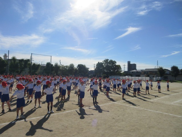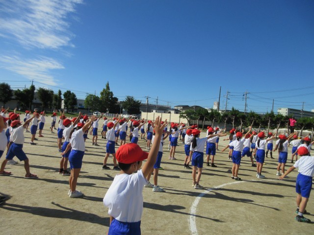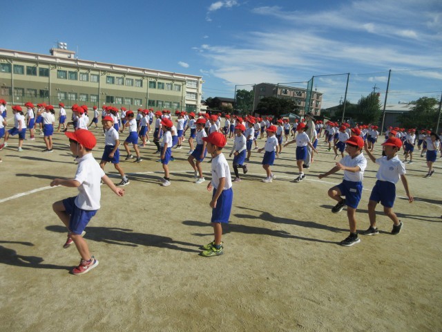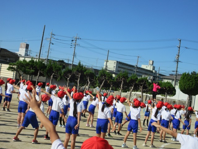 運動会練習の様子です。3年生は玉取りの間にダンスをします。ダンスのステップについて先生のお手本にあわせて練習をいています。手のあげ方もそろえられるように、みんなで練習しています。
