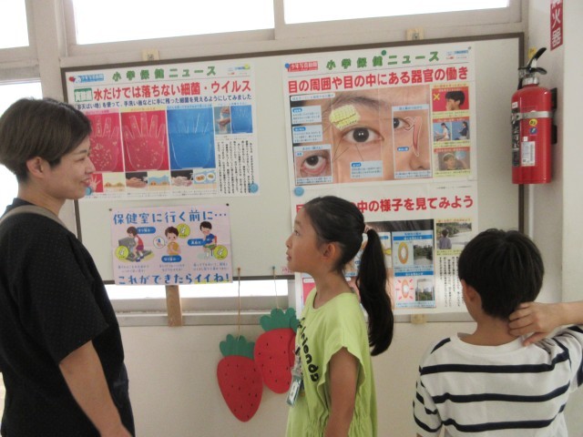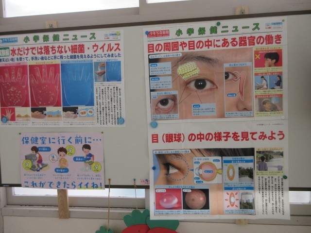 保健室前の掲示板には健康や安全について季節に合わせて紹介があります。10月に入って、目についての紹介にかわっています。早速掲示物を見つけた子どもたちが先生に質問をしていました。興味をもってくれてうれしいです。かけがえのない目を大切にしてくださいね。