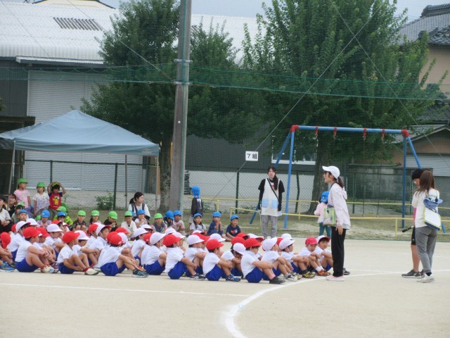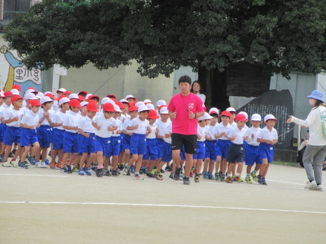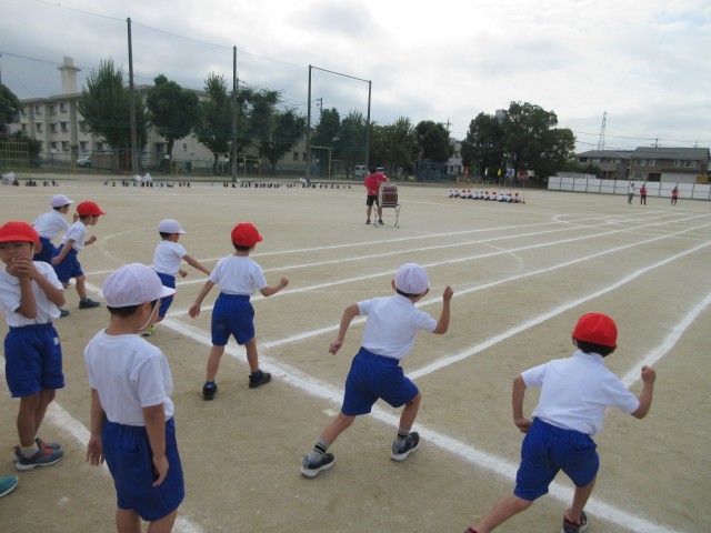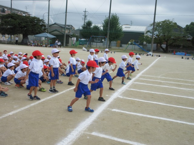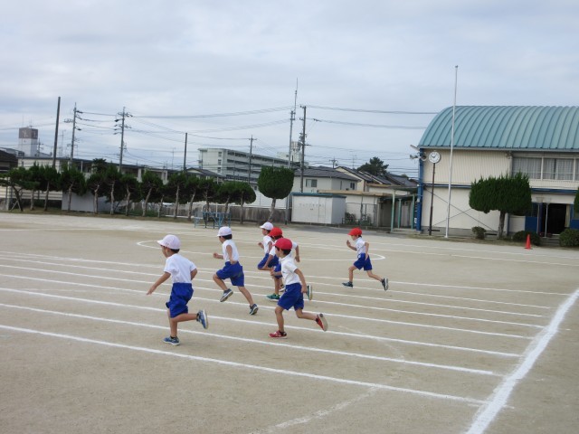 1年生のかけっこの練習の様子です。今回は太鼓を使って実際にはしってみました。「いちについて、よーいドン」のタイミングで上手くスタート、最後まで全力で走ってくださいね。