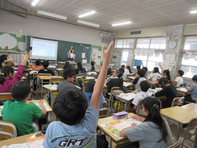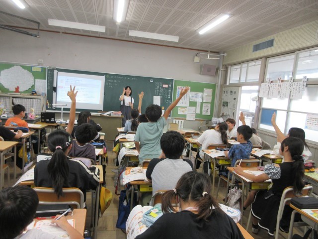 5年生の授業の様子です。家庭科では「ごはんとみそ汁」について学び始めました。今回のめあては「ごはんとみそ汁についてくわしく調べよう」です。まずはみんなが知っていることを発表しています。