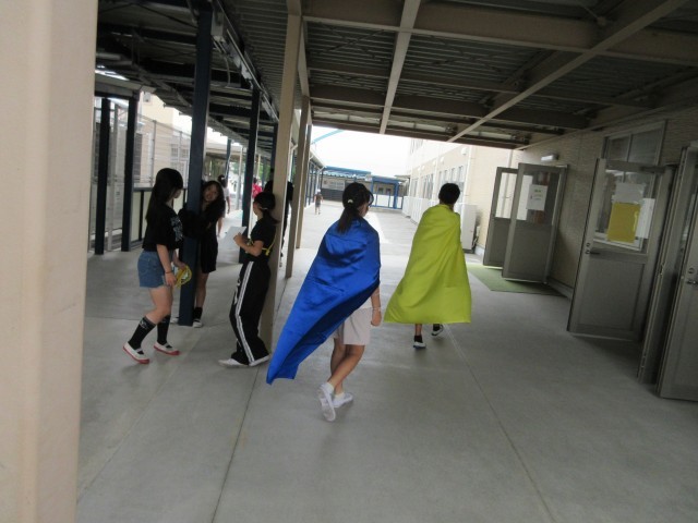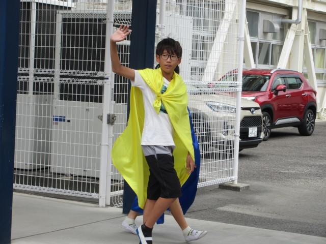 小野っ子のヒーロー、がんばるマンの活動の様子です。カラフルなマントを翻し、校内でがんばっている人を探しいています。がんばるマンを見つけたらぜひ、お話してみましょう。