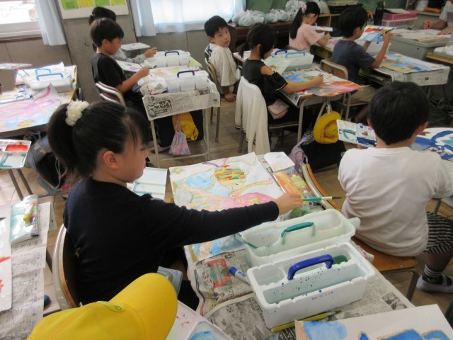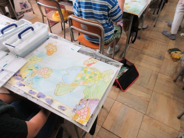 3年生の授業の様子です。図工では読書感想画に取り組んでいます。「にじいろのさかな」の物語を聴いて、お気に入りの場面を描いています。もうすぐ完成ですね。