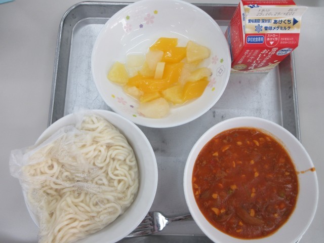 今日の給食は、ソフトめん、牛乳、ミートソース、男鹿なし入りフルーツミックスです。男鹿なしの産地である秋田県男鹿市は春日井市の交流都市です。しゃりっと甘い秋の味覚をフルーツミックスにして楽しむことができました。