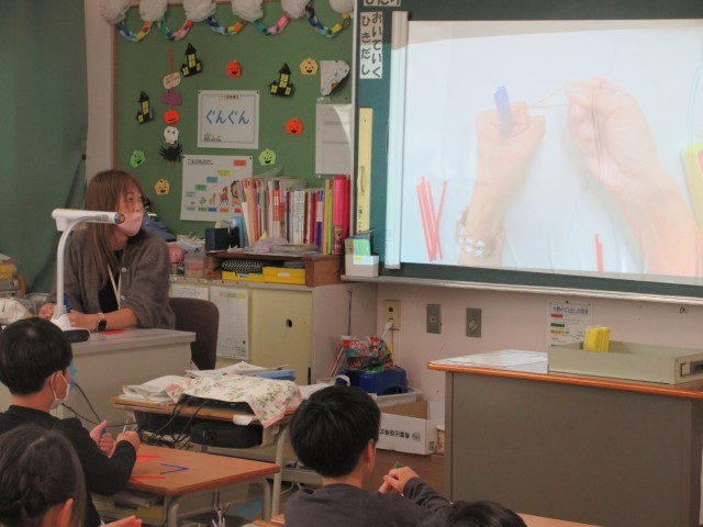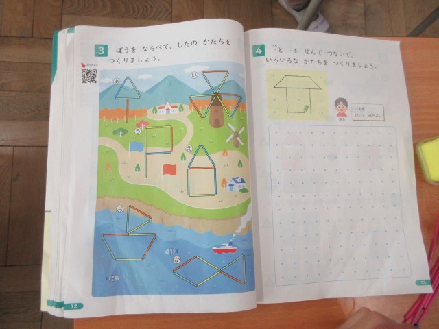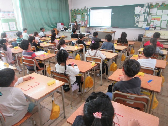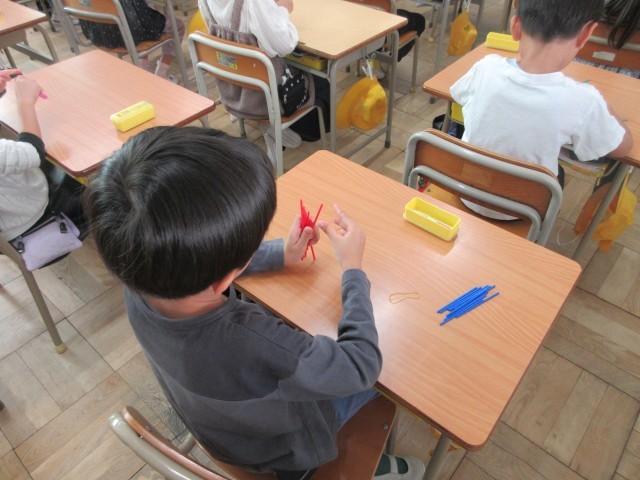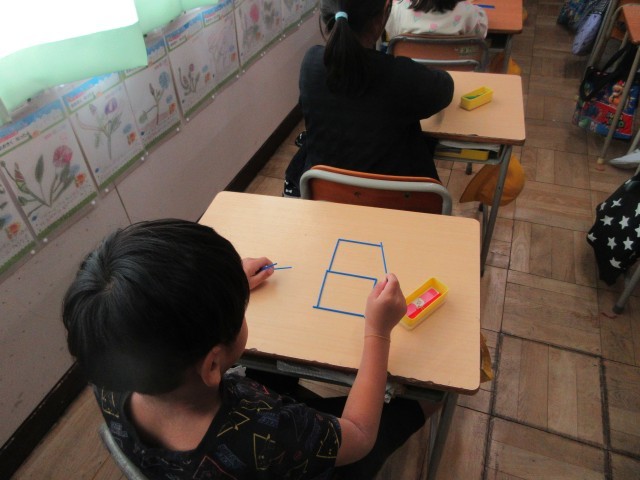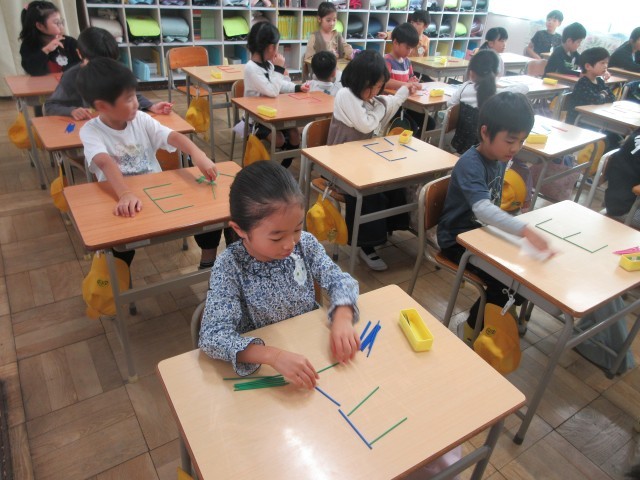 1年生の授業の様子です。算数では「かたちづくり」をしていました。棒の並べ方を工夫していろいろな形を作っていましたね。教科書の問題が終わると、自分たちで好きな形をつくったり、先生と一緒に数字の8の文字を3や5に変身させたりしました。次は色板を使って形づくりをする予定です。