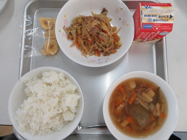 今日の給食は、ごはん、じゃがいもだんご汁、切り干し大根のソースいため、バナナチップスです。切り干し大根は生の大根より栄養価が高く、意外といろいろな料理に使えます。今日のソース炒めは焼きそばのような味で、喜ばれていました。