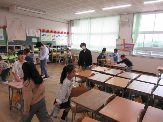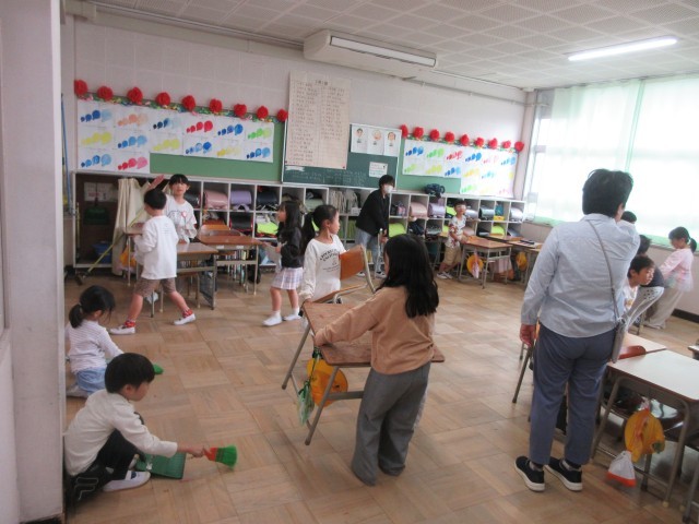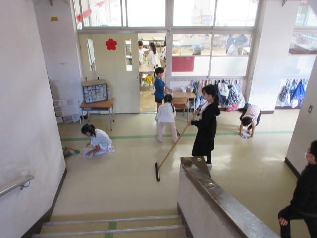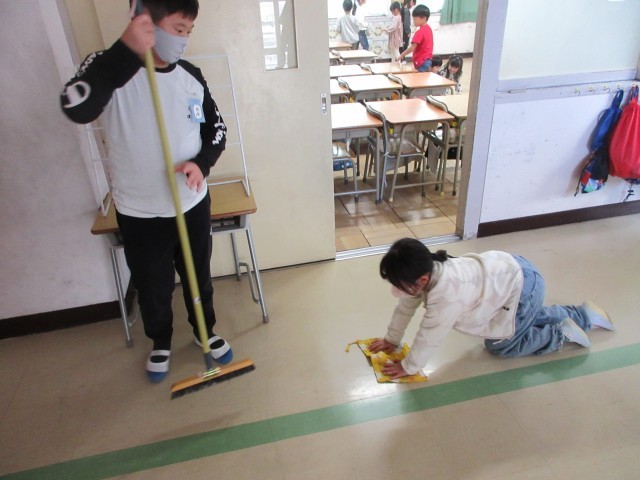 そうじの様子の一コマです。 1年生と6年生が一緒にそうじをしています。毎日1年生はおにいさん、おねえさんに手伝ってもらいながら仲良くそうじをしていますね。微笑ましい一コマです。