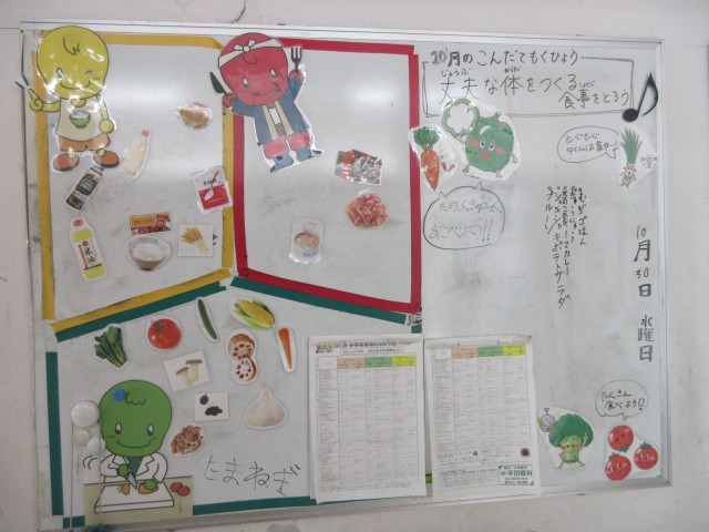 10月30日(木)今日の一言話は応募献立についてと「みんなでもぐもぐ大作戦」の話がありました。みんなでもぐもぐ大作戦は、ひとりひとりがいつもよりも一口でも多く給食を食べて栄養をしっかり体に届けようという取り組みです。好き嫌いなくバランスよく栄養をとることで丈夫な体をつくることができます。みんなが健康に過ごせるように、食べられる食材が捨てられる「食品ロス」を減らすためにもしっかり食べることに挑戦してみましょう。仲間とおいしくできるだけ残さずいただき、健康に過ごしましょう。