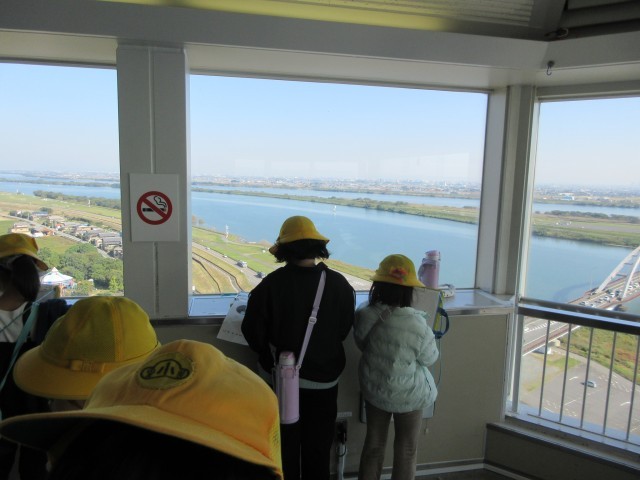 10月30日(木)4年生は校外学習で木曽三川公園と輪中の郷に行きました。木曽三川公園ではタワーに上り、展望台から木曽三川の様子を観察しました。教科書で学習した通りの分かれ方や川の大きさに驚いていました。その後輪中の家も見学しました。水害に立ち向かう人々の苦労を感じられました。午後からは輪中の郷に行き、伊勢湾台風をはじめ長島町の方の生活について学習しました。とてもよい校外学習になりました。