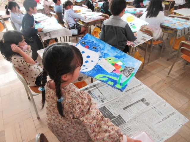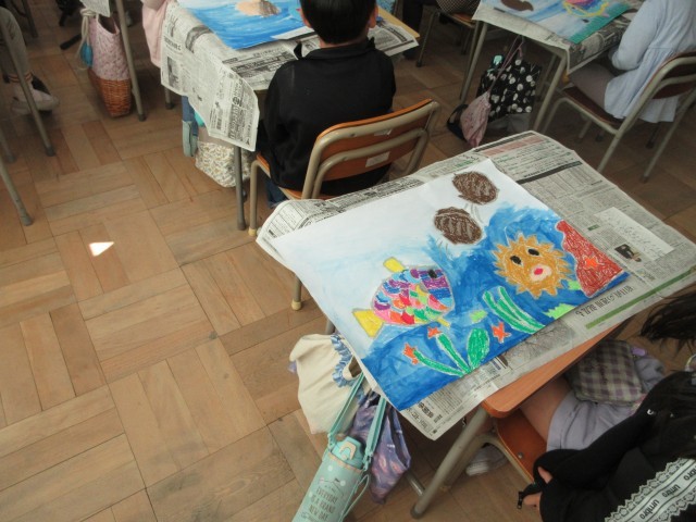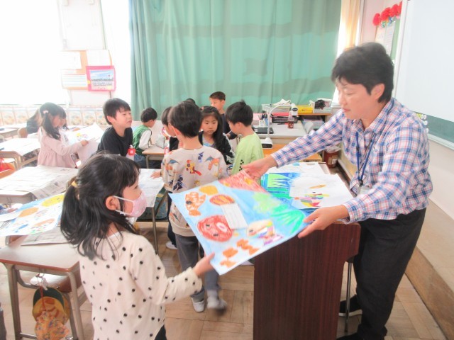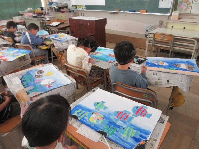 1年生の授業の様子です。いよいよ読書感想画の仕上げです。最後に「きらきらの光る銀のうろこをはろう」が今日のめあてです。銀色の折り紙をうろこの形に切って、思い思いの場所にはりました。大切な作品を完成させたら、名札には工夫したところ、見てほしいところなど書きました。頑張った作品だから、先生に提出するときも大切に持っていきましたね。