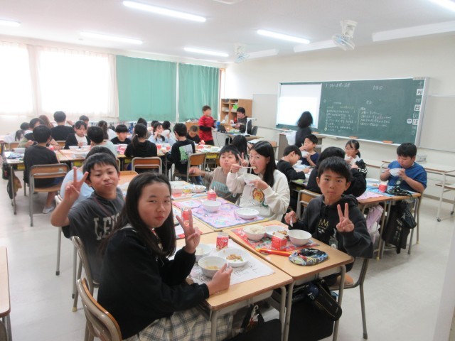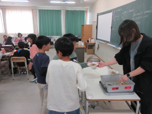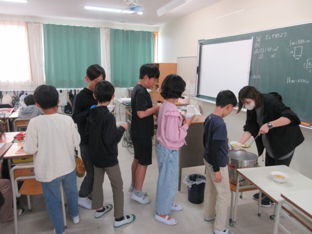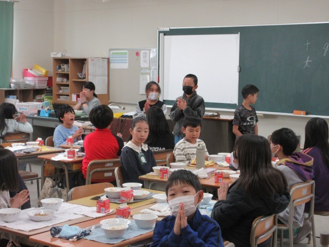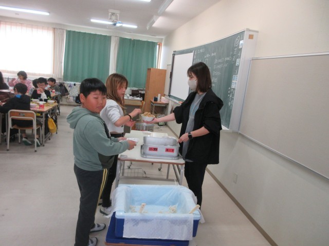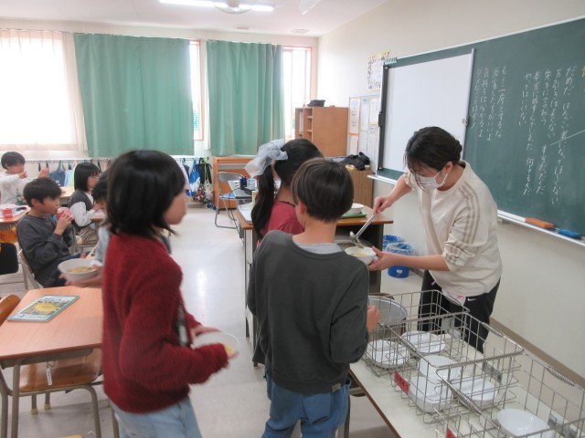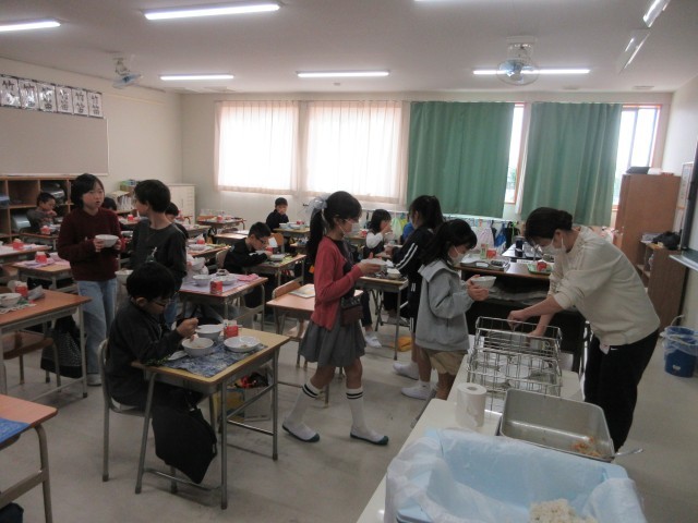 11月4日(火)給食の様子を紹介します。4年生の教室ではみんなでなかよく給食を頂いていました。おかわりをしている子どもたちもたくさんいましたね。食欲の秋ですね。