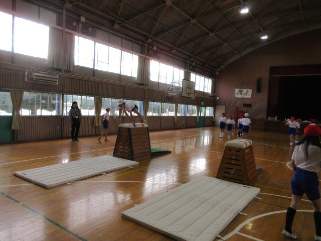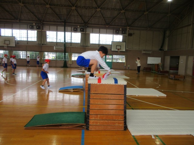 4年生の授業の様子です。体育館では跳び箱に取り組んでいます。まず最初に高さになれるように跳び箱に乗るところからはじめました。高さに慣れてきたところで、跳び箱の手を付く位置を確認し、練習を重ねています。だんだん高さをあげ、8段に挑戦している子どもたちもいました。