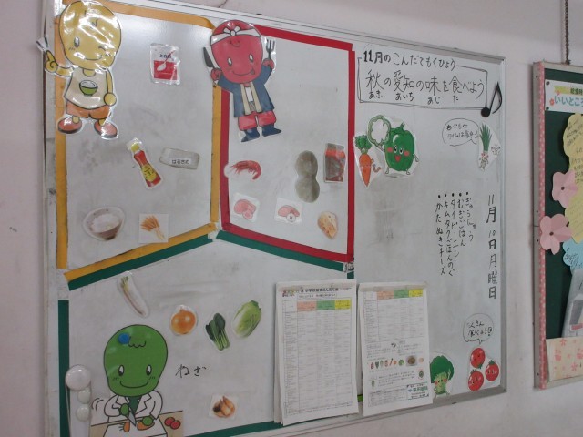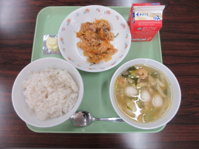 11月10日(月)今日の給食一言話は、キムタクごはんの具についてです。長野県は漬物文化が伝統の地域ですが、子どもたちの漬物離れが進んでいました。そこで子どもたちに漬物をおいしく食べてもらいたいという想いから、キムタクごはんを塩尻西部中学校の栄養士さんが考えたそうです。タイピーエンに入っているうずら卵は、よくかんで食べましょう。