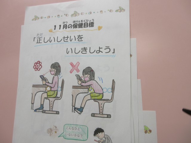11月11日(火)保健目標を担当クラスで発表するために、6年生の保健委員さんは保健室で練習をしていました。お陰でこの後教室で自信をもってみんなに保健目標を伝えることができますね。