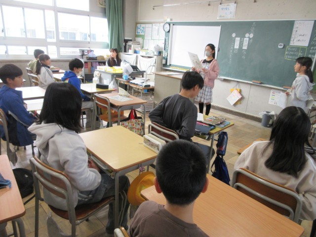 11月の保健目標を6年生が担当クラスへ紹介にいきました。3年生と5年生の様子を紹介します。「正しい姿勢をいしきしよう」の目標に合わせて、姿勢をよくする座ってできる体操をしました。みんなもちょっと時間がある時に意識してやってみてくださいね。