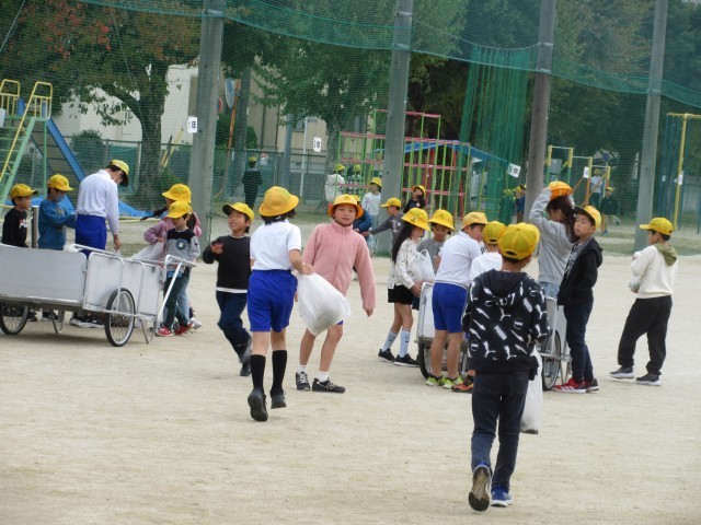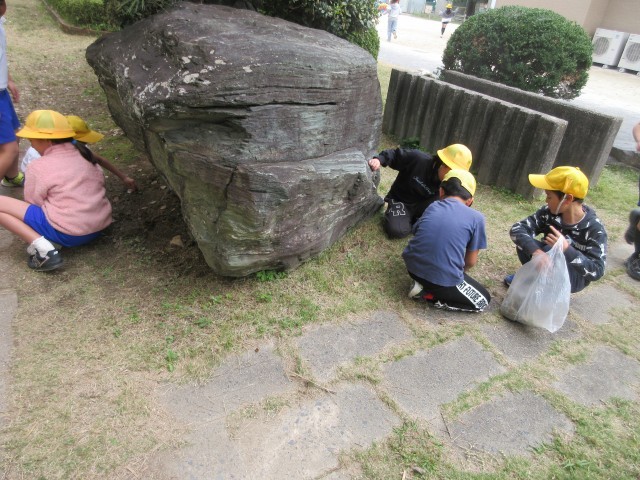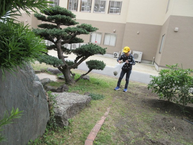本館と南館の間にある畑や花壇の周辺の外そうじの様子です。抜いた草や落ち葉はビニール袋にいれて、そうじの終わりには環境委員のお兄さんお姉さんが待つ、リアカーに持っていきます。畑や花壇の周りをきれいにしてくれてありがとう。