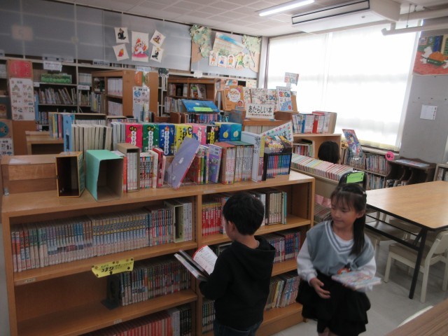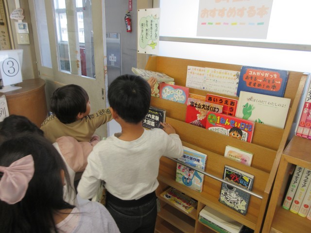 1年生は先生と一緒に本をかりに図書室に行きました。どの本にしようかな?探す時間も楽しいですね。