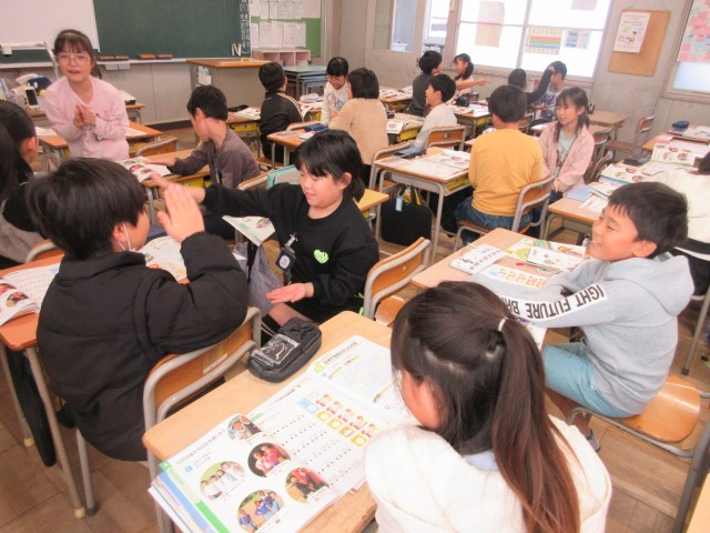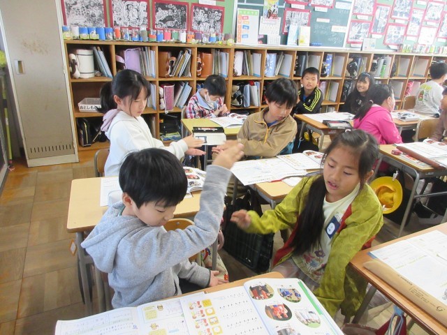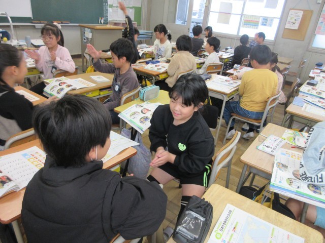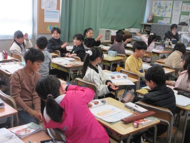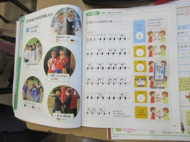 3年生の授業の様子です。音楽では「十五夜さんのもちつき」の練習をしていました。歌をうたいながら餅つきの動作をしていましたね。隣同士でペアーを組み餅つきの練習中です。