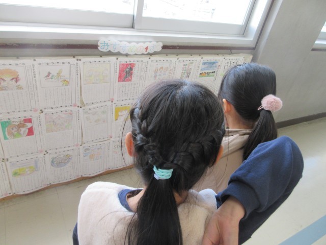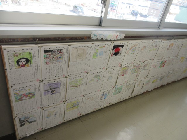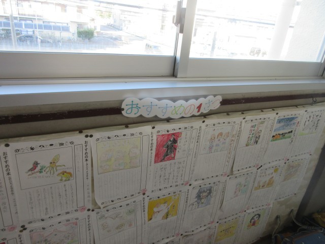 図書室前にはおすすめの本を紹介するコーナーがあります。あじさい読書週間の際に全校のみなさんが書いてくれた本の紹介カードが掲示されています。みんなのおすすめの本をぜひ読んでみてくださいね。