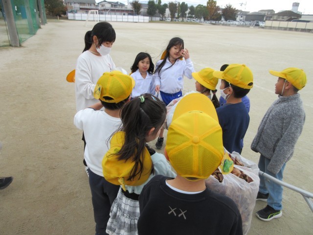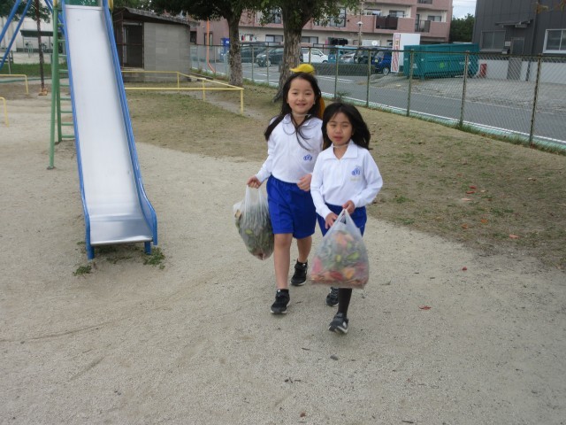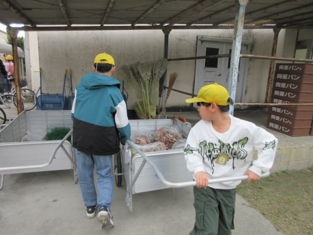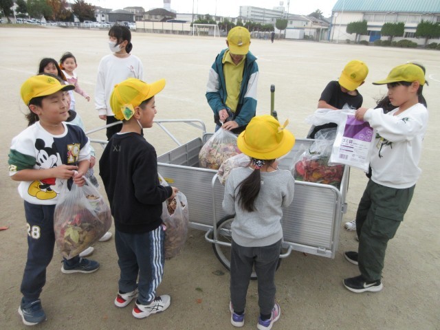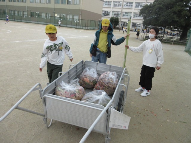 引き続き、落ち葉拾いの様子です。外掃除のみんなは環境委員のお兄さんやお姉さんのリヤカーまで落ち葉を運びます。今回は何と4袋にもなりました。みなさんありがとうございました。