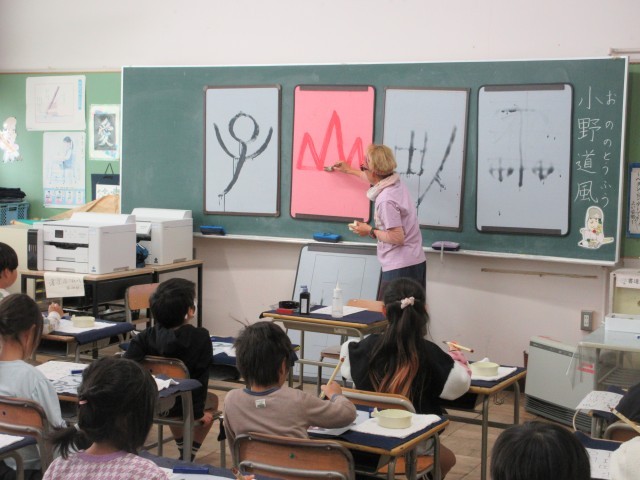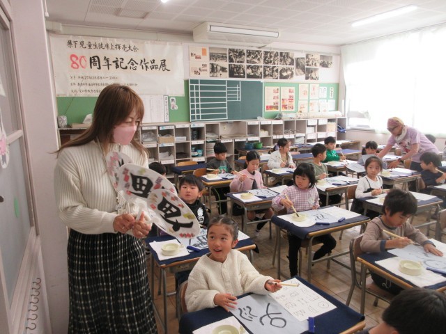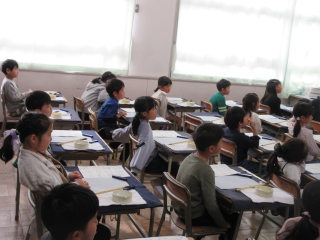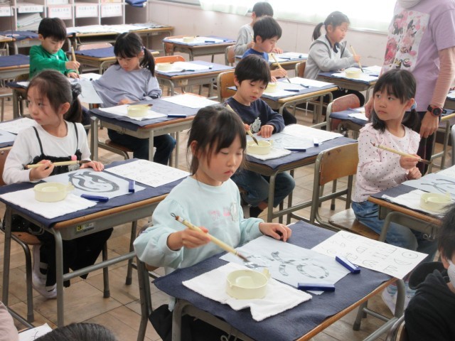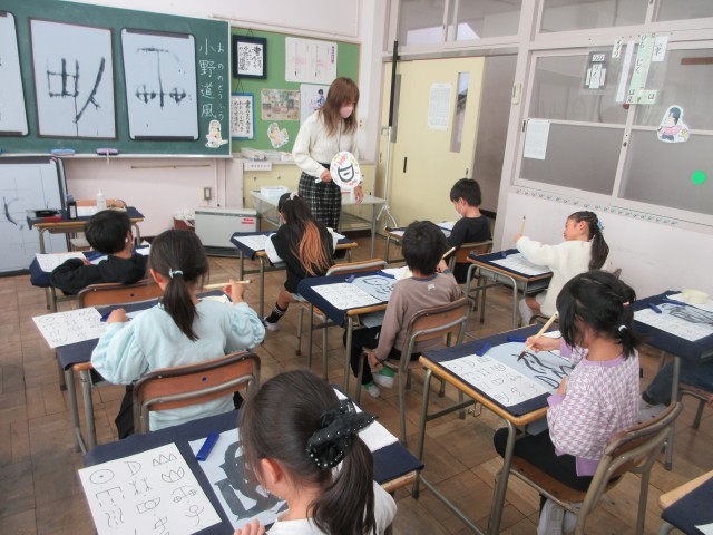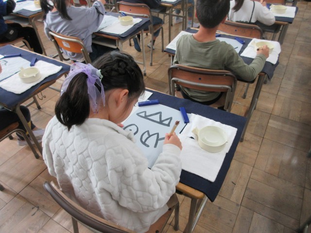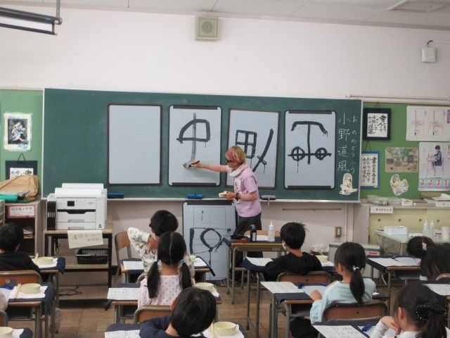1年生の授業の様子です。書の時間で書作品づくりをはじめました。象形文字を筆使いの基本、上から下へ、左から右へとかき方を特別講師の先生に教えていただきました。楽しい雰囲気の中で、水習字で練習をしています。書作品はうちわに墨で文字を書く予定です。完成まで少しづつステップアップしていきましょう。