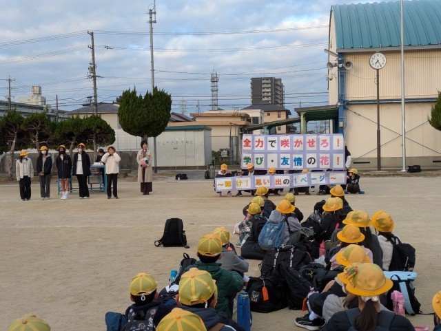 6年生は、修学旅行に出発します。健康確認の後、実行委員を中心に出発式を行いました。