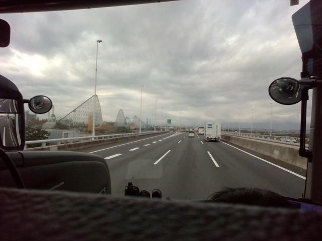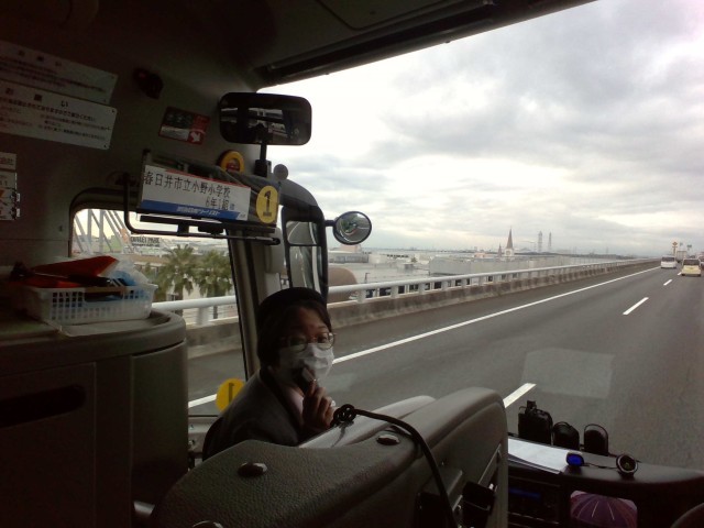 11月19日(水)修学旅行1日目 バスの一コマです。元気にバスに乗り込み、大勢の先生方に見送って出発しました。ガイドさんの話をよく聴き楽しく過ごしています。歴史の学習の成果が見えています。先程は長島スパーランドの紹介があり、みんなが左側にみえる「スチールドラゴンに乗りたい」と言っていましたね。現在順調に進んでいます。