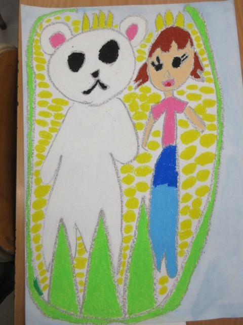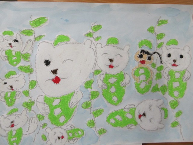 2年生の図工の作品です。「食べ物の中に動物が入ったら・・・。」というテーマで絵をかきました。見ていると「なんて、かわいい!!」と感じる絵ばかりです。工夫がいっぱい詰まっています。細かい部分もがんばって色を塗りました。
