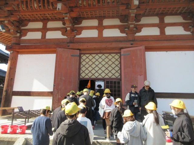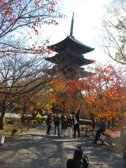 修学旅行見学地の最終は東寺です。五重の塔、講堂、金堂見学に続き、最後に小野道風公ゆかりの柳とカエルをみました。美しい紅葉、そして小野小ゆかりの道風公の柳とカエルの見学ができてよかったですね。次は昼食会場へ向かいます。