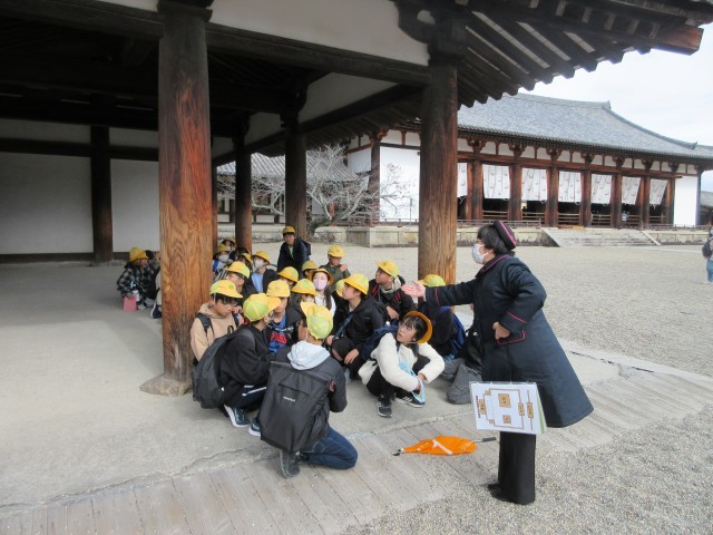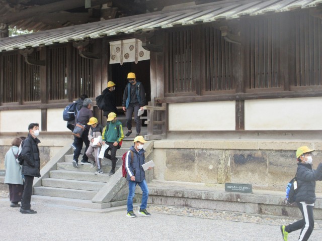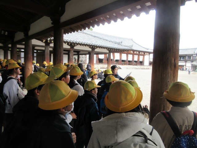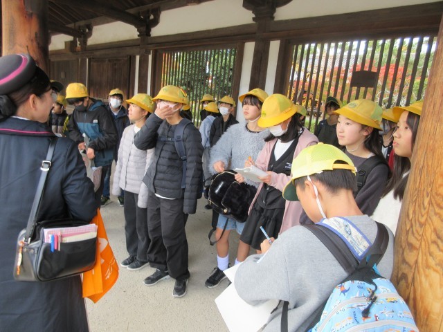 最初の見学地、法隆寺の様子です。ガイドさんのお話を良く聴き、メモもしっかり取っていましたね。国宝の数々を間近に見ることができました。