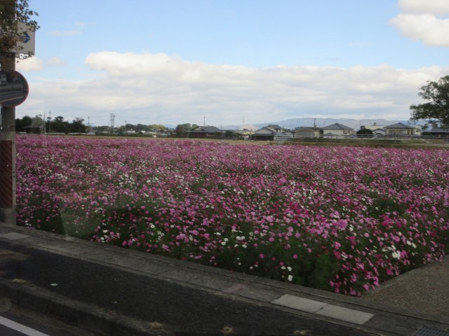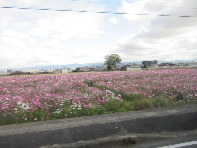 法隆寺から東大寺に移動するときに、ご褒美のようなコスモス畑を見ることが出来ました。まさに淡いピンク色のお花の絨毯ですね。