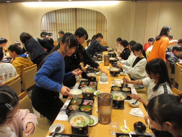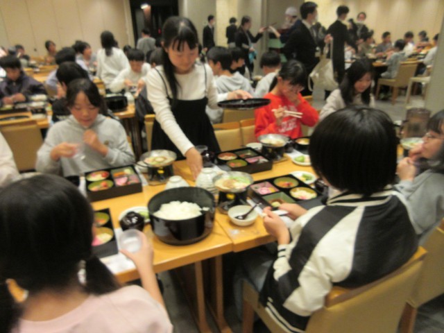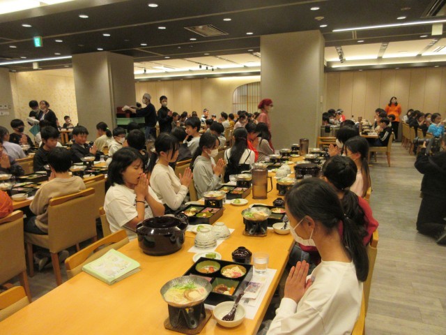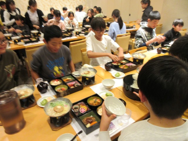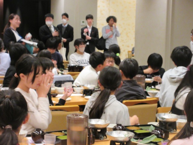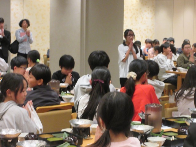 ホテル本能寺で夕食を頂きました。お腹がペコペコの小野っ子のみなさんにとって待ちに待った時間です。実行委員の「いただきます」のあいさつで食事がはじまりました。食事の終わりは感謝の気持ちをこめて「ごちそうさま」のあいさつを実行委員がつとめました。一人ひとりが考えたみんなへのメッセージもつけて話がありましたね。