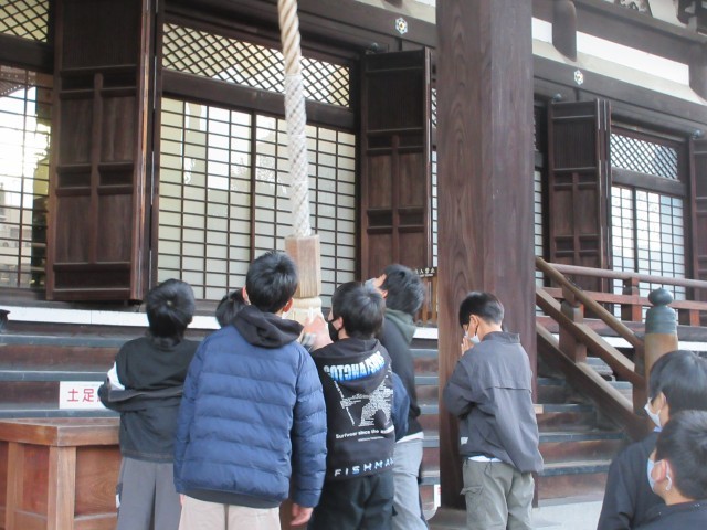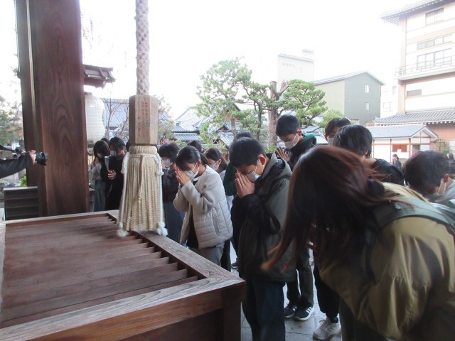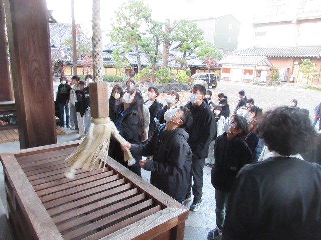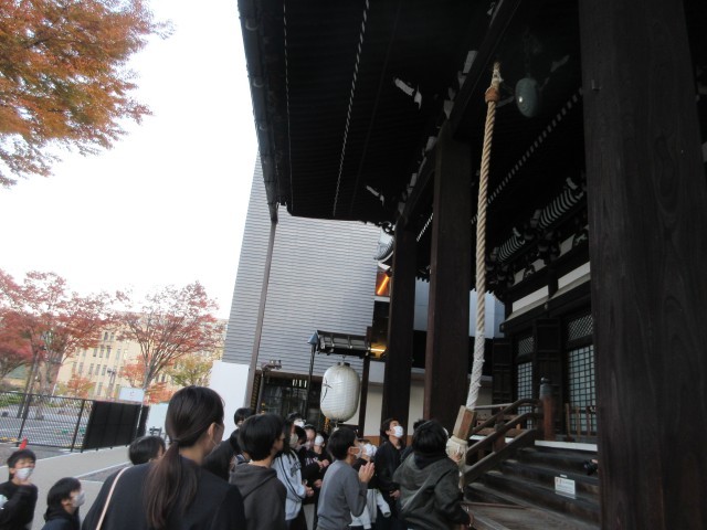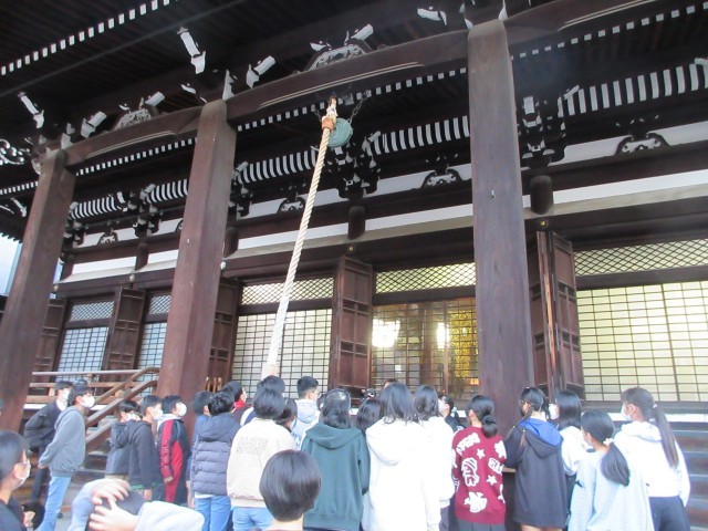 2日目最初の修学旅行名場面です。朝の本能寺拝観の様子です。ホテル本能寺のすぐとなりにお寺はあります。みなさんがよく知っている愛知の三英傑「織田信長」ゆかりの寺ですね。朝の時間だったので幸いにもクラス単位でお参りとお願いをすることができました。みんなの願いが叶うといいですね。