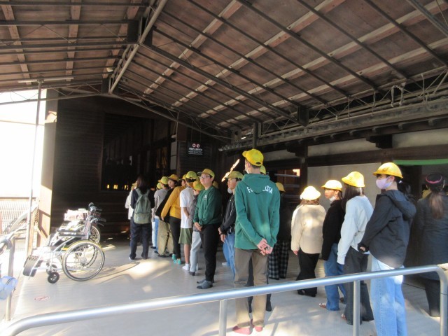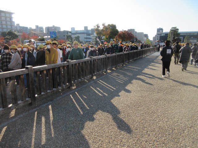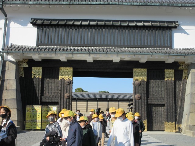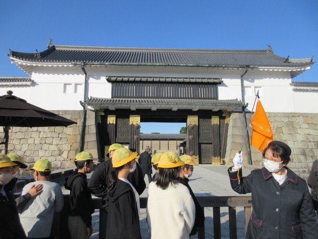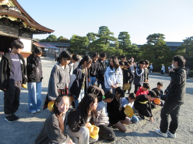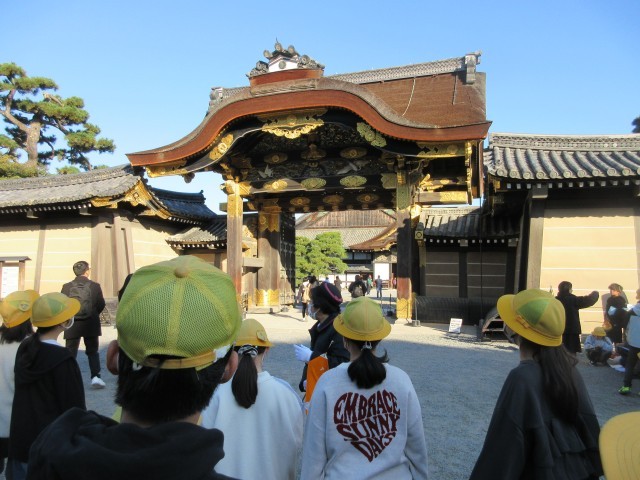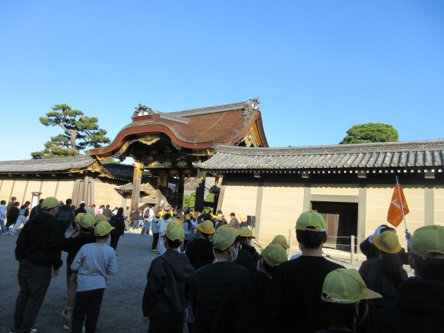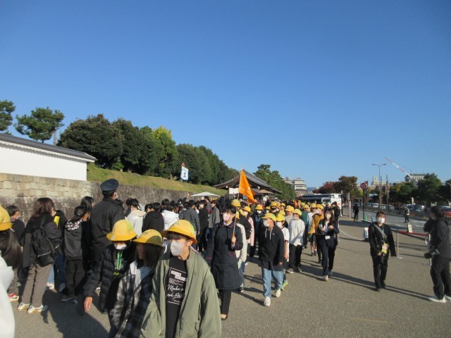 修学旅行の2日目は昨日以上に良い天気となりました。青空に二条城が映えています。まずは二条城開城前の様子です。長い長い行列ができていました。開城と同時に入りましたね。