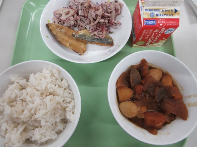 今日の給食は、麦ごはん、牛乳、みそおでん、あじの竜田揚げ、れんこんのゆかり和えです。みそおでんは愛知県の郷土料理です。豆味噌文化が根付いている愛知県ならではの料理ですね。