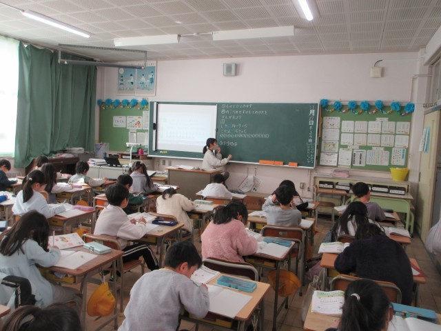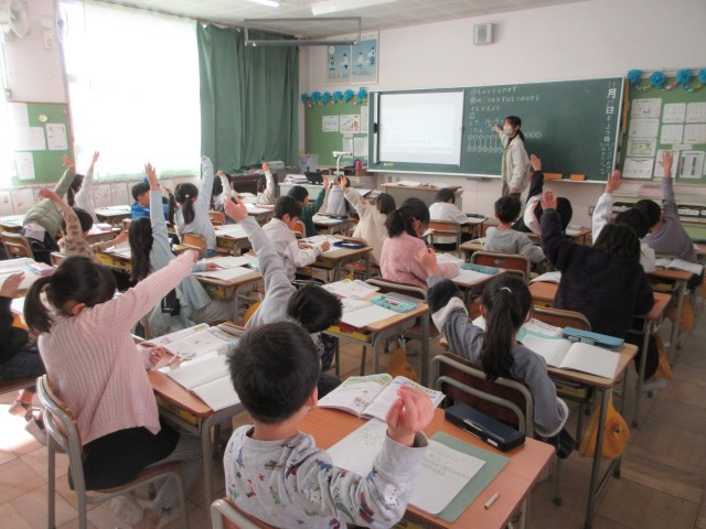 1年生の授業の様子です。算数では「ものとひとのかず」について学んでいます。文章問題ですが、何が問われているのか?答えの単位は何になるのか?一つ一つ丁寧に先生と一緒に取り組んでいます。1年生のみなさん、よく集中していますね。