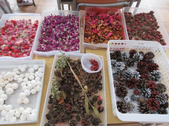 自然の植物、ボタン、リボン・・・・・。とってもかわいいアイテムをリースにつけていきます。ボンドでつけるとき、細かい手先の作業で一苦労している子もいました。できあがりは、見事です!クリスマスが楽しみですね。