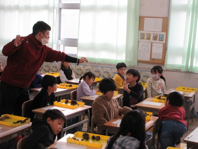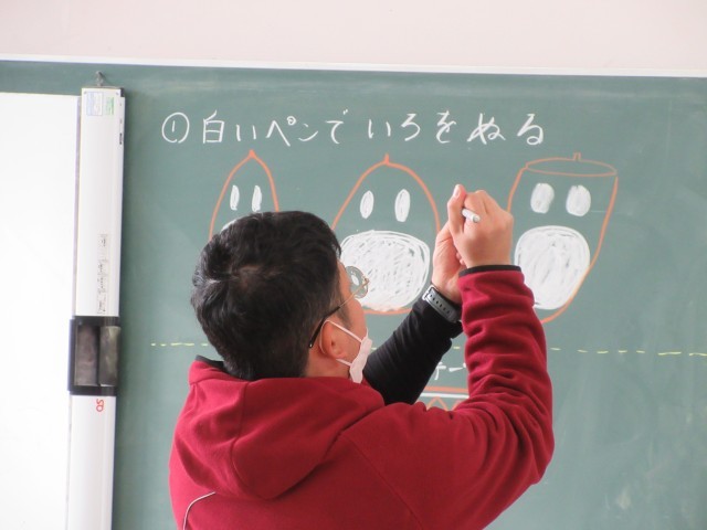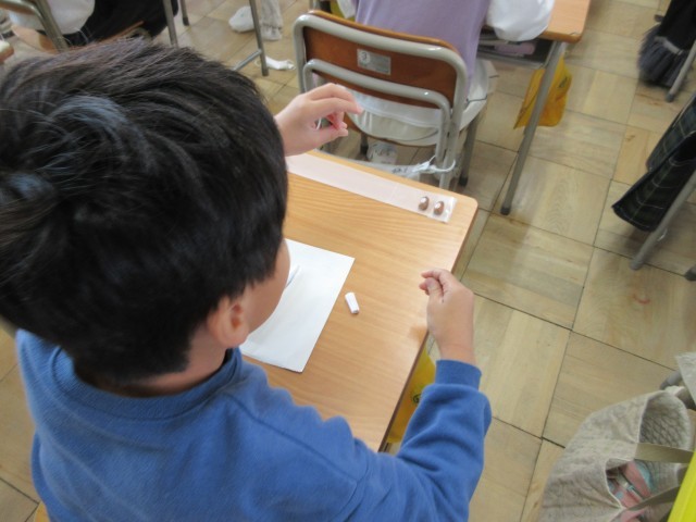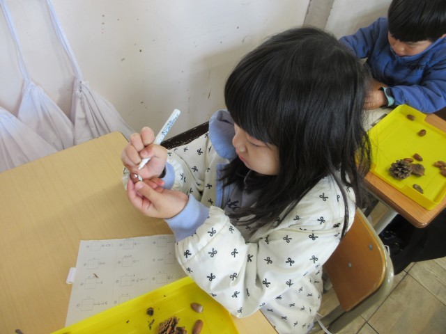 1年生がみんなで集めたどんぐりでトトロをつくっている一コマです。まず最初に、白いペンで目とお腹をぬります。白のインクが乾くまでテープの上でどんぐりが転がらないように固定しました。次は黒のペンで目や模様を描きます。完成したトトロの作品は、個人懇談会の時に持って帰って頂きました。