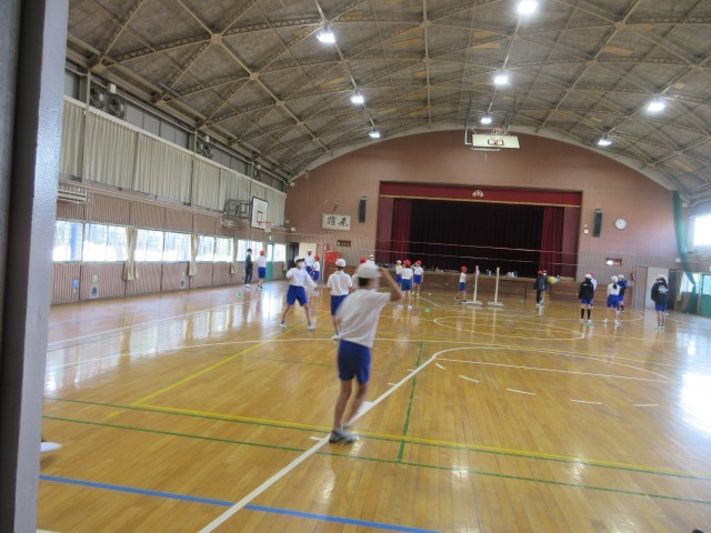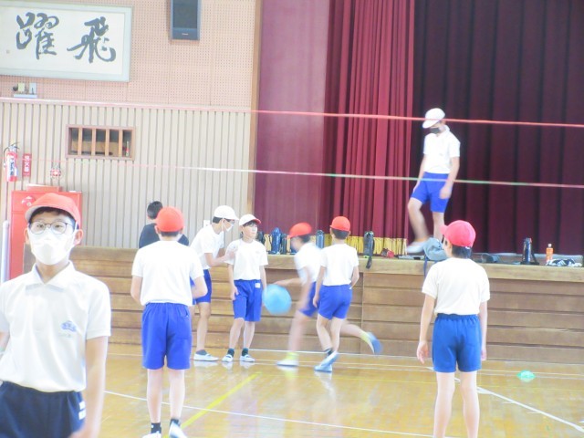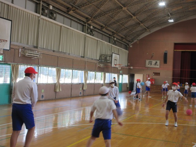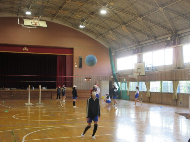 6年生の授業の様子です。体育館ではソフトバレーボールを練習しています。パスの練習をグループでしたり、パスのテストをうけたりしていましたね。