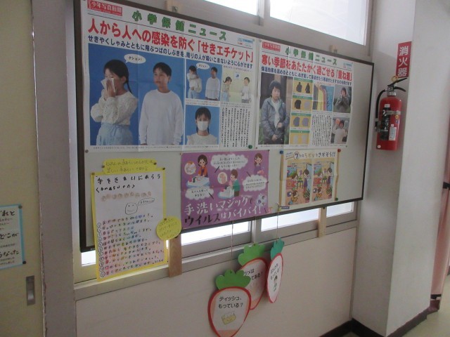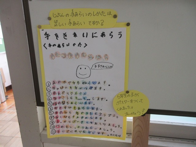 保健室前の掲示板に注目です。5年生が手洗いについてポスターを作ってくれました。早速朝の1年生の係の子が見つけて、見ていましたよ。小野っ子のみなさん、手洗いのポイントが分かりやすく書いてあります。ぜひ見てくださいね。そして正しく手洗いをして、元気にすごしましょう。