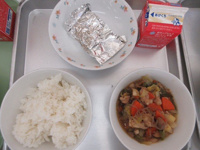 今日の給食は、ごはん、牛乳、ひきずり、さば銀紙焼きです。ひきずりは愛知県の郷土料理です。養鶏が盛んだった愛知県ならではの鶏料理です。今日はひきずりの中にしめじが入っていたのですが、1年生のある児童がとても大きい笠を見つけたようで、喜んで教えてくれました。