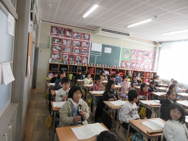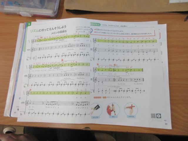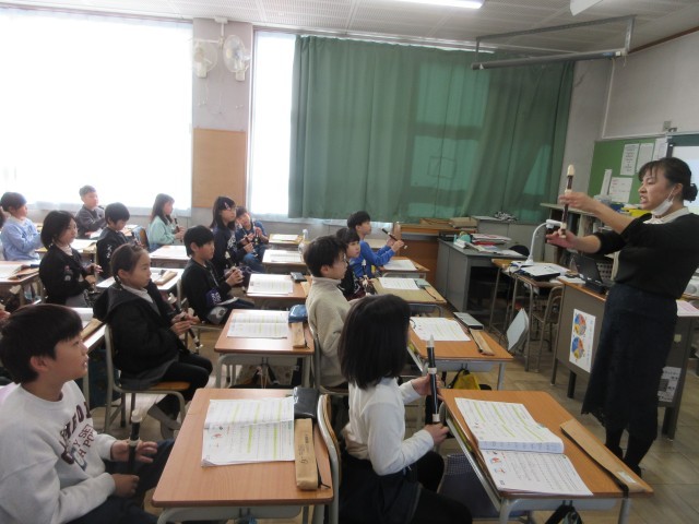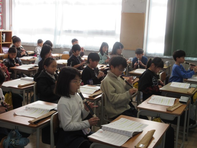 3年生の授業の様子です。音楽ではリコーダーの練習をしています。「リズムにのって演奏しよう」をめあてに「メロンの気持ち」の曲に取り組んでいます。「シ」と「ラ」の音が何度も繰り返し出てきますね。まずは、「声に出し」、次は「指使いだけ」、そして最後は「リコーダーを吹いてみる」と繰り返し練習しています。