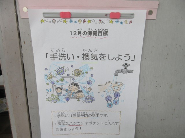 12月の保健目標を紹介します。手洗い・換気をしようです。12月も残すところ登校日は、後7日です。手洗い・換気をして、みんなが元気に2学期のまとめができるといいですね。そして楽しみな冬休みを健康に過ごせるようにこの後の生活でも手洗いと換気を気をつけてください。